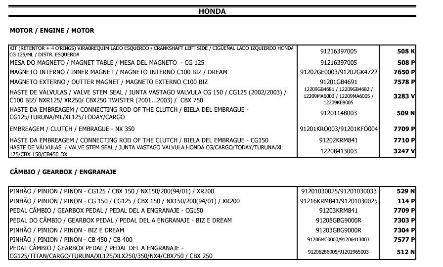 - CG 150 / CG 125 (2002/2003) / C100 BIZ / NXR125 / XR250 (TORNADO) / CBX250 (TWISTER 2001... 2003) e CBX 750 são so mesmos ! pq ele pega todos esses nºs de série Honda de cada uma dessas peças (tem lá), e diz que o nº Corteco de equivalência é um só, o 3283 V ! é só abrir os arquivos que eu copiei e colei acima, que vc vai ver...
